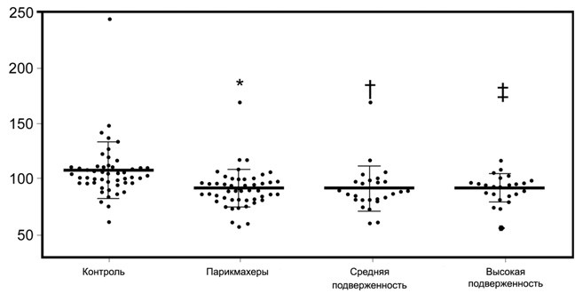 Рис. 1. Форсированная жизненная емкость (ФЖЕ) парикмахеров была значительно ниже по сравнению с контрольной группой. По результатам анализа подгрупп, ФЖЕ парикмахеров со средней и высокой подверженностью была достоверно ниже, чем в контроле. ˟Р=0,04. †Р=0,009. ‡Р˂0,001.